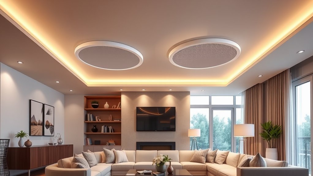 Audio quality performance is essential when choosing 8-inch in-ceiling speakers, as it directly impacts your listening experience. Look for speakers with a frequency response range of at least 40Hz to 20kHz; this guarantees you get deep bass and clear highs. High sensitivity ratings of 90 dB or above allow for louder sound levels with less power, enhancing performance. Check the power handling capability, typically between 80 to 140 watts, to match your audio system’s output. Opt for quality materials like polypropylene cones and silk dome tweeters to reduce distortion and improve clarity across various genres. Finally, confirm the speakers have an impedance rating of 6 to 8 ohms to prevent damage and maintain stable performance with your audio receiver.