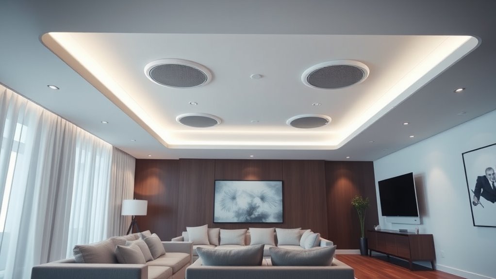 Choosing the right in-ceiling speakers is crucial for achieving high-quality audio performance in your space. Look for speakers with a wide frequency response, ideally between 50 Hz and 28 kHz, to capture both deep bass and crisp highs. Higher sensitivity ratings, above 90 dB, will provide better sound output with less power, enhancing clarity. An impedance rating of 8 Ohms guarantees compatibility with most audio systems and stable signal transmission. Quality drivers, like an 8-inch woofer paired with a 1-inch tweeter, can improve sound depth. Additionally, aimable tweeters allow you to direct sound toward the listening area, while acoustic baffles enhance sound dispersion, guaranteeing an immersive audio experience throughout your home.