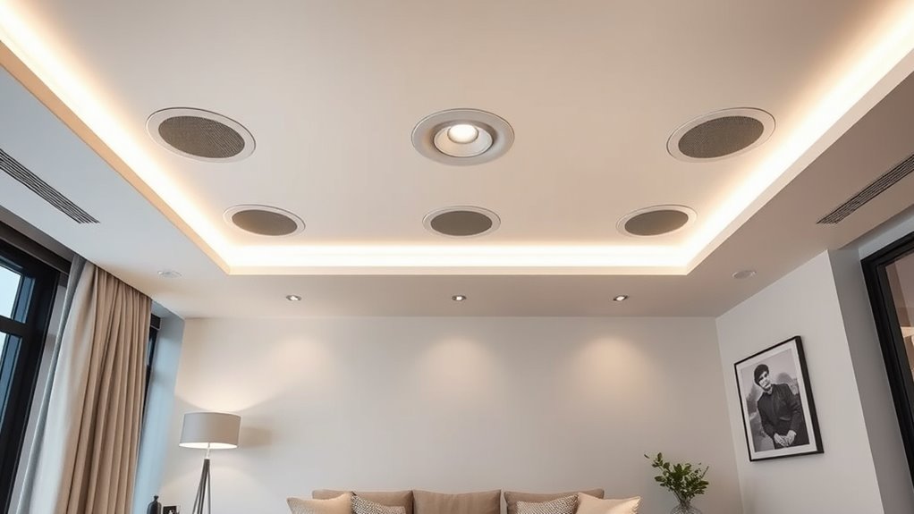 When considering small in-ceiling speakers, it’s essential to keep design aesthetics in mind, as they can greatly influence the overall look of your space. Many models feature a flush mount style, allowing them to blend seamlessly into ceilings and walls, which creates a clean and unobtrusive aesthetic. You’ll find that compact dimensions, typically around 8 to 10 inches in diameter, facilitate installation without overwhelming your room’s design. Additionally, paintable grilles let you customize the speakers to match your interior decor. The choice of materials, like ABS plastic or mineral-filled polymer cones, enhances durability while contributing to a modern look. If you’re considering moisture-resistant models, they offer both functionality and aesthetic appeal in spaces like bathrooms or kitchens.